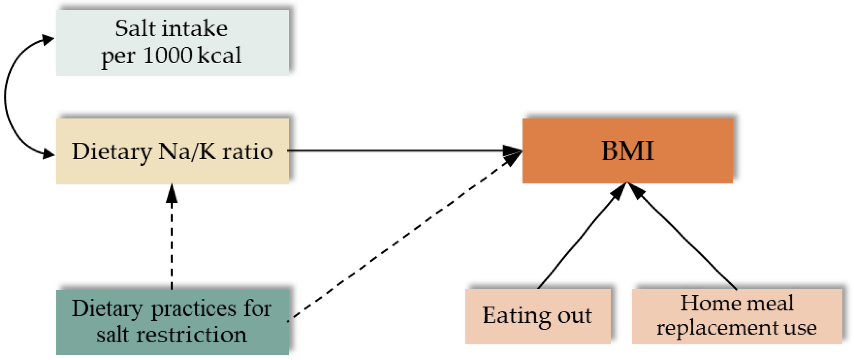 図2 減塩習慣と食塩摂取量、食品Na/K比、およびBMIの関連の検証後モデル